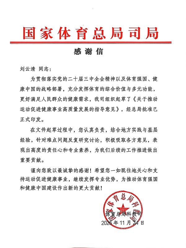 近日,体育医院收到国家体育总局科教司发来的感谢信,对刘云清同志在《关于推动运动促进健康事业高质量发展的指导意见》起草工作中的突出贡献,予以高度肯定与诚挚感谢。 该《指导意见》是贯彻党的二十届三中全会精神、落实体育强国与健康中国战略的重要文件,已获国家体育总局批准正式印发。刘云清同志立足常州本地运动促进健康的实践经验,在文件起草中针对难点问题深研细究、广纳多方意见,以高度责任心与专业素养助力文件完善,既展现了个人能力,也体现了体育医院在基层运动健康服务领域的实践积累。 常州市体育医院将以这份肯定为动力,持续深耕运动医学与健康促进领域,把政策精神转化为临床服务、科研创新的实际成效,打造基层运动健康服务标杆,让科学运动理念扎根常州、惠及百姓,书写属于常州体育健康事业的新篇章。