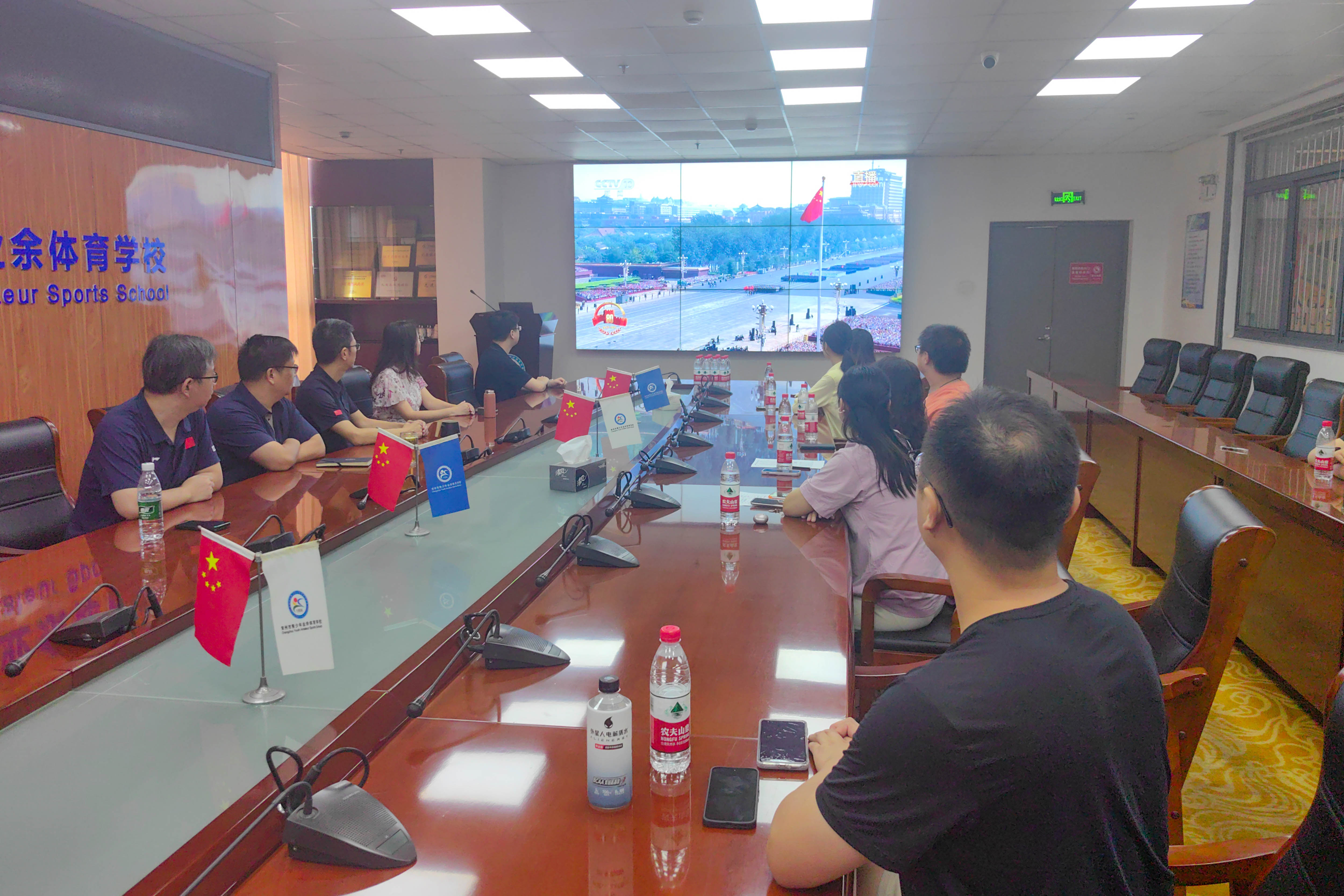 全体党员、教职工和部分运动员整齐就坐在会议室中,神情庄重,认真观看阅兵仪式的每一个环节。大家认真聆听习近平总书记重要讲话,认真思考精神内涵。当看到空中护旗梯队、徒步方队、战旗方队等依次通过天安门广场时,大家深刻感受到了祖国的繁荣昌盛和这一天的来之不易。而装备方队展示的新一代传统武器装备以及部分无人智能、水下作战、网电攻防、高超声速等新型作战力量,让大家充分感受到了我国国防实力的不断增强。空中梯队呼啸而过,战机在空中留下绚丽的轨迹,也让现场的气氛达到了高潮。