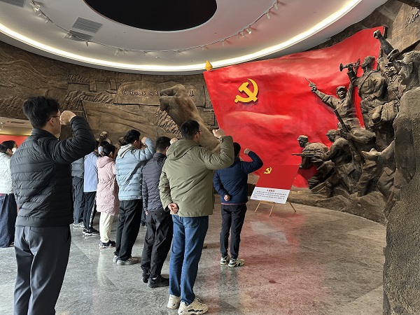 在新馆鲜红的党旗下,全体党员举起右拳,由党支部书记领誓,重温入党誓词。铿锵有力的誓言回荡在展厅,既是对革命先辈的庄严告慰,也是对初心使命的再次叩问。